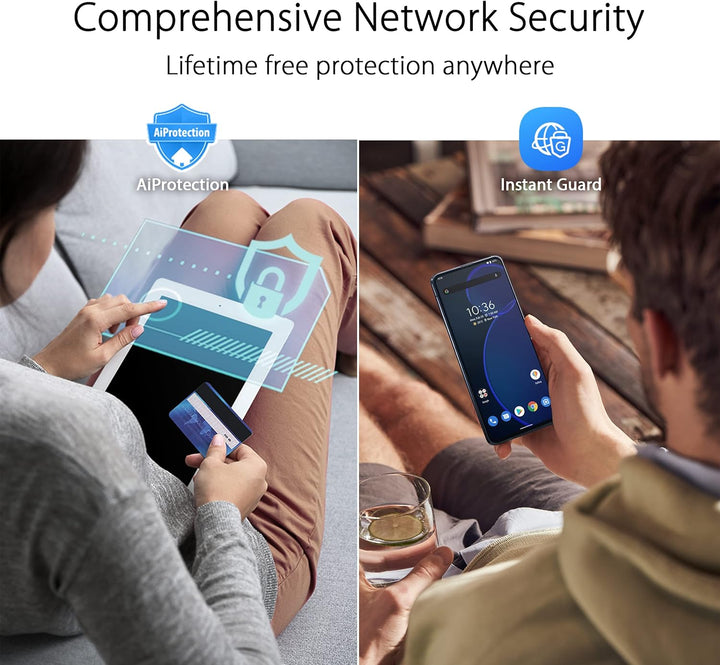 - Umfassende Netzwerksicherheit – Kostenloses lebenslanges Abonnement für AiProtection by Trend Micro und ASUS Instant Guard, das dein WLAN sichert und deine Geräte schützt, wo immer du bist.