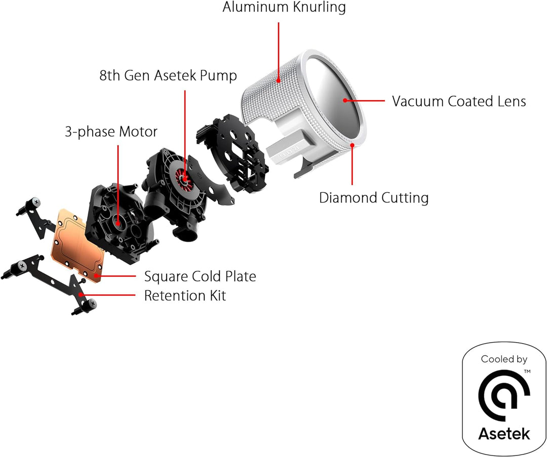 - Die neueste Asetek-Pumpe der 8. Generation ist mit einem 3-Phasen-Motor ausgestattet, der die ultimative Kühlleistung mit höherem Durchfluss und geringerer Impedanz liefert