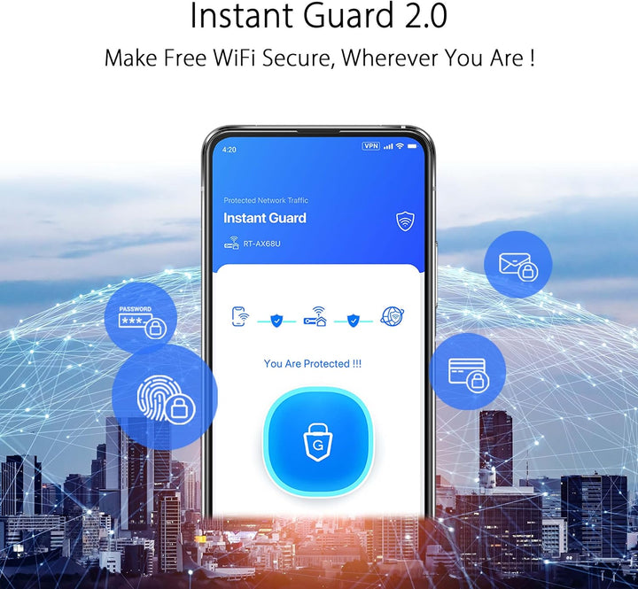 • Sicherheit in kommerzieller Qualität überall – Schützen Sie Ihr Heimnetzwerk mit AiProtection Pro, powered by Trend Micro. Und wenn Sie unterwegs sind, bietet Ihnen ASUS Instant Guard ein sicheres VPN, das Sie mit einem Klick teilen können