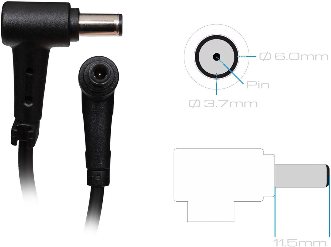 - Steckertyp: rund, Steckerform: 90° abgewinkelt, Aussendurchmesser des Steckers: 6,0 mm, Innendurchmesser des Steckers: 3,7 mm, Länge des Steckers: 11,5 mm, Stift im Stecker: Ja, Länge des Anschlusskabels vom Netzteil zum Notebook: ca. 1,50 m