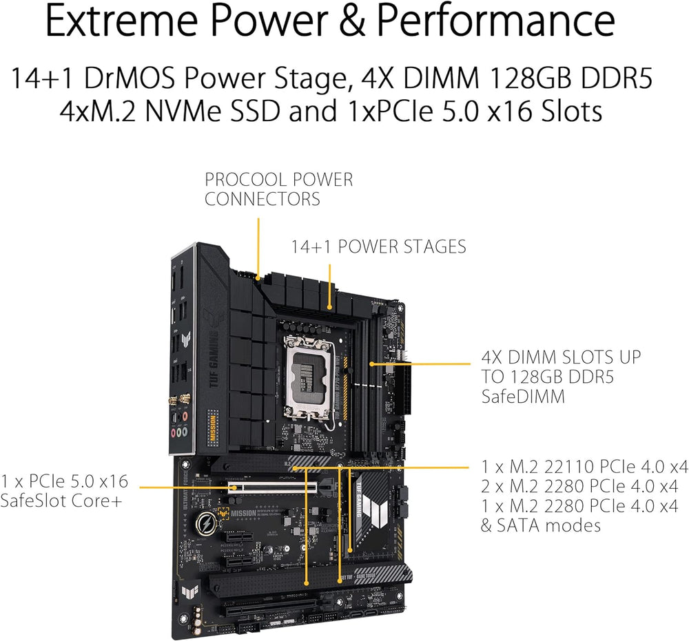 - Neueste Konnektivität: PCIe 5.0-Steckplatz, PCIe 4.0 M.2-Steckplätze, rückseitiger USB 3.2 Gen 2x2 Type-C, Frontpanel-Header für USB 3.2 Gen 1 Type-C und Thunderbolt 4(USB4)-Header-Unterstützung