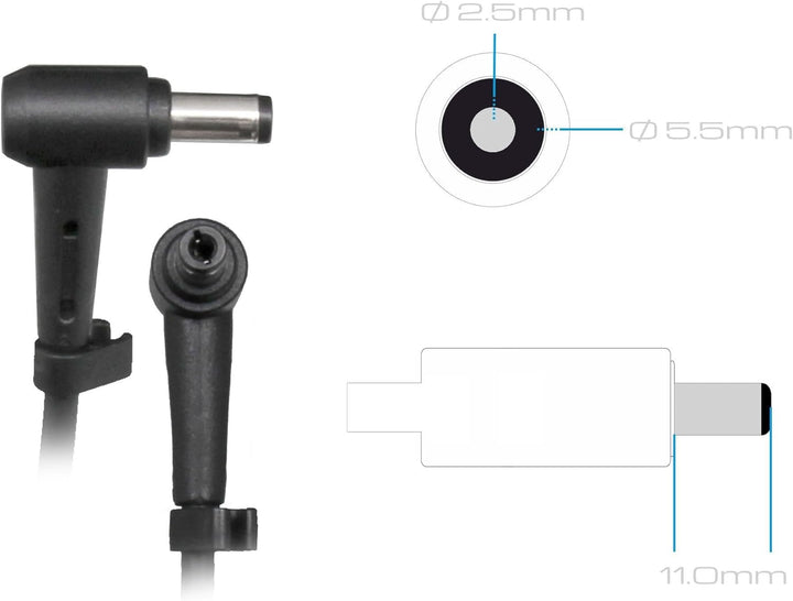 - Steckertyp: rund, Steckerform: 90° abgewinkelt, Aussendurchmesser des Steckers: 5,5 mm, Innendurchmesser des Steckers: 2,5 mm, Länge des Steckers: 11,0 mm, Stift im Stecker: Nein, Länge des Anschlusskabels vom Netzteil zum Notebook: ca. 1,70 m