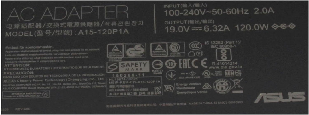 - Spannung: 19 Volt, Stomstärke: 6,32 Ampere, Ausgangsleistung: 120 Watt, Eingangsspannung: 100-240V / 50-60Hz, Energieeffizienz: VI