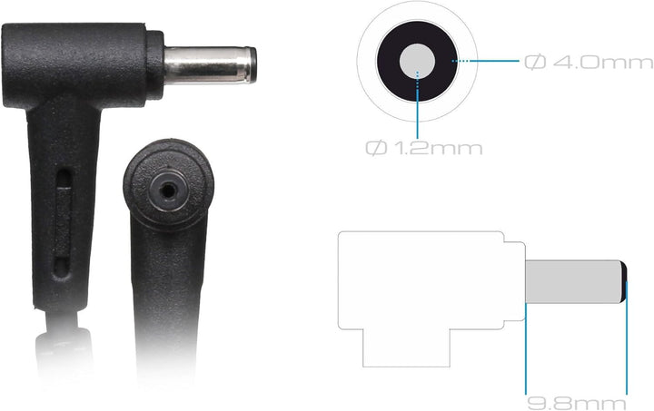 - Steckertyp: rund, Steckerform: 90° abgewinkelt, Aussendurchmesser des Steckers: 4,0 mm, Innendurchmesser des Steckers: 1,2 mm, Länge des Steckers: 9,8 mm, Stift im Stecker: Nein, Länge des Anschlusskabels vom Netzteil zum Notebook: ca. 2,00 m