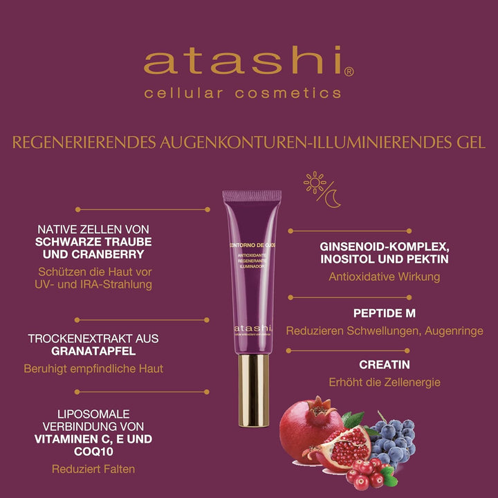 - VERMINDERT TRÄNENSÄCKE UND AUGENRINGE. Die antioxidative Augenkontur ist mit Peptiden M formuliert, die Tränensäcke und Augenringe reduzieren. Das Antialterungs-Contour von Atashi mit HaloxylTM verringert Tränensäcke und fördert die Resorption von