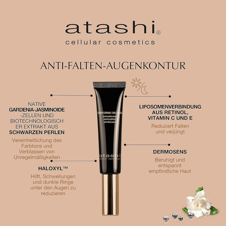 - Die Augenkontur der Anti-Aging-Linie atashi enthält Gardenia Jasminoide, die die Kollagenproduktion um 33% steigern und die Zellmatrix wiederherstellen. Retinol im Molekularfilm reduziert Falten in Anzahl, Fläche, Länge und Breite.