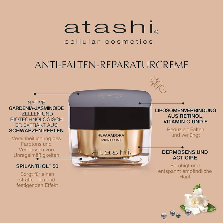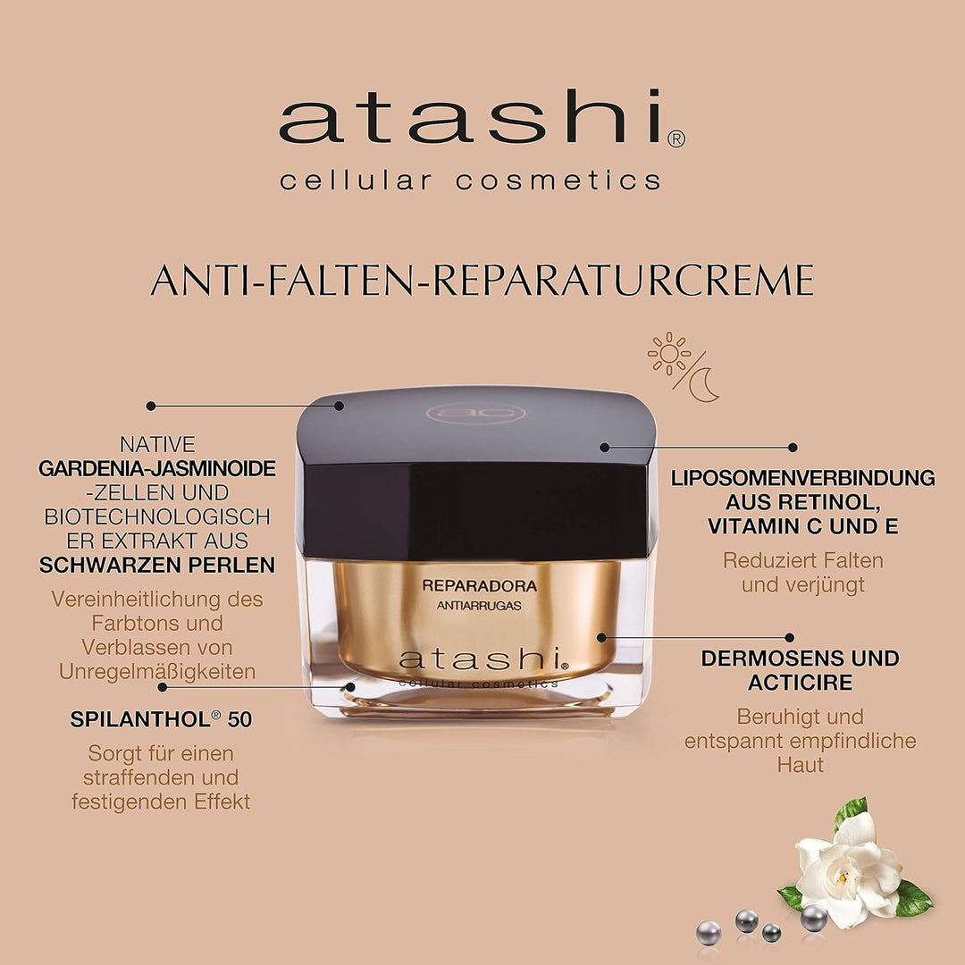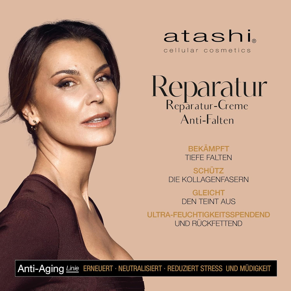 - Die Anti-Falten-Repair-Creme aus der Anti-Ageing-Linie von atashi enthält ausserdem Retinol und Vitamin E, die Falten tiefenwirksam reduzieren und die Kollagenfasern schützen.