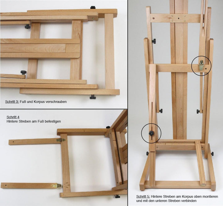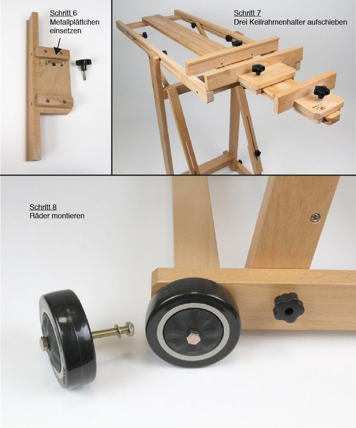 - EINFACH: Die Staffelei ist teilmontiert und lässt sich mit wenig Aufwand schnell aufbauen: Zuerst muss der Fuss mit den beiden Querstreben zusammengebaut werden, danach schieben Sie die Ausziehstrebe ein. Nun müssen die beiden hinteren Stützen montiert werden. Zuletzt werden die drei Keilrahmenhalter auf die Mittelstrebe geschoben. Wenn gewünscht können dann noch die zwei Räder angebracht werden. Sie finden alle Bilder für die Montage bei den Produktfotos. Aufbauzeit max. 15 Minuten.
