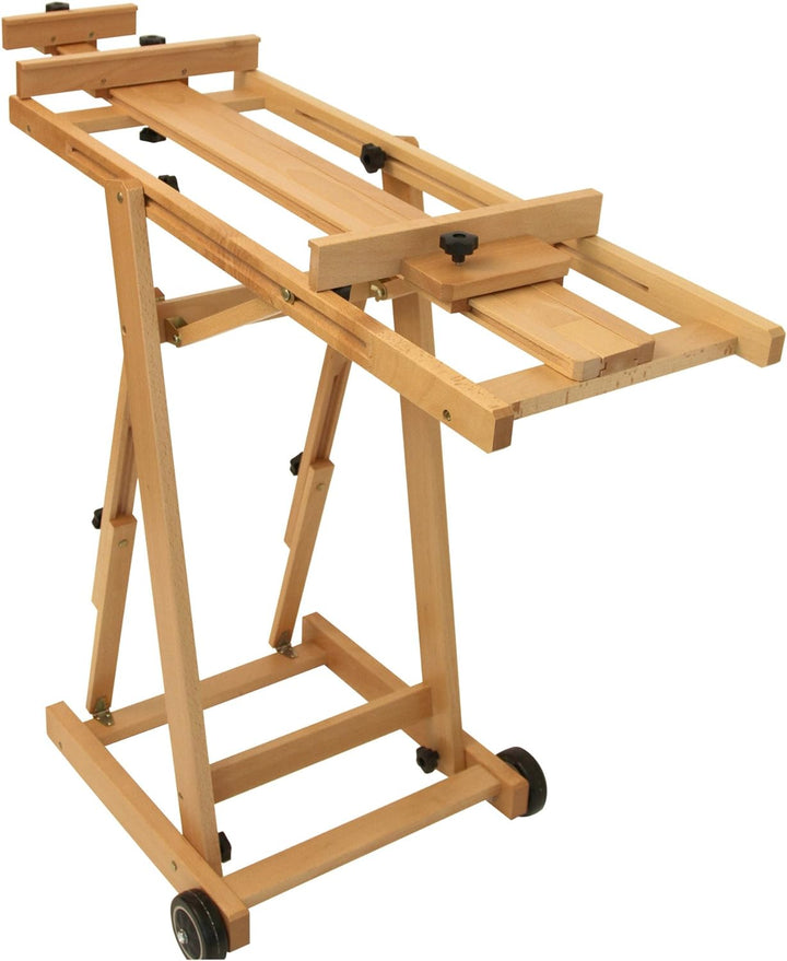 - STABIL: Bei dem Modell 131 handelt es sich um eine flexible Profi-Staffelei aus feinem, lasiertem Buchenholz vom Fachhändler für Künstlerbedarf. Sie zeichnet sich durch hohe Stabilität und Standfestigkeit aus, da sie eine grosse H-Auflagefläche hat. Die Aufstandfläche am Boden beträgt: Breite inkl. Räder ca. 57cm, Tiefe ca. 53 cm. Durch die zwei Rollen können Sie die Staffelei problemlos verschieben. Das Gewicht der Staffelei beträgt ca. 11,5kg.