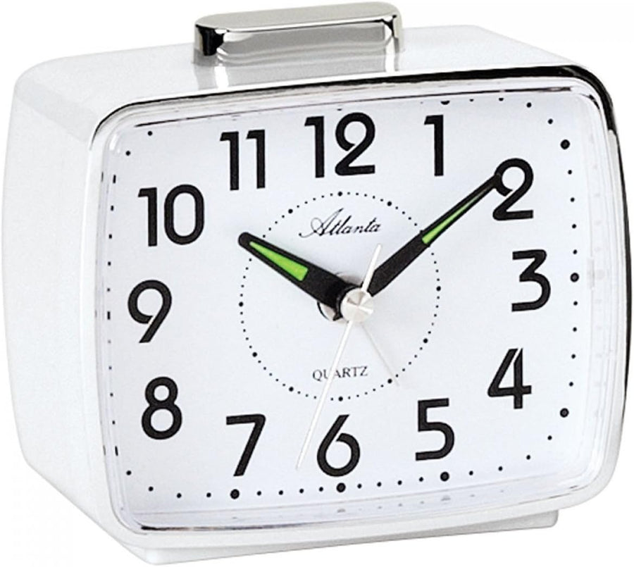 PRODUKTBESCHREIBUNGEN * Marke: Atlanta * Artikelnummer: 1654-0 * Modellname: Glockenwecker * Anzeige: Analog * Uhrglas: Plastik * Zifferblattfarbe: weiss * Gehäuse Material: Kunststoff * Gehäuseoberfläche: glänzend * Gewicht der Uhr: 177,5 gramm * Funktionen: Licht; Alarm * Masse: 9 x 10,5 cm * Weckton: Glockenton * Gehäusefarbe: weiss * Leuchtzeiger * Inklusive Batterie * wird in einer Atlanta Verpackung geliefert Mehr