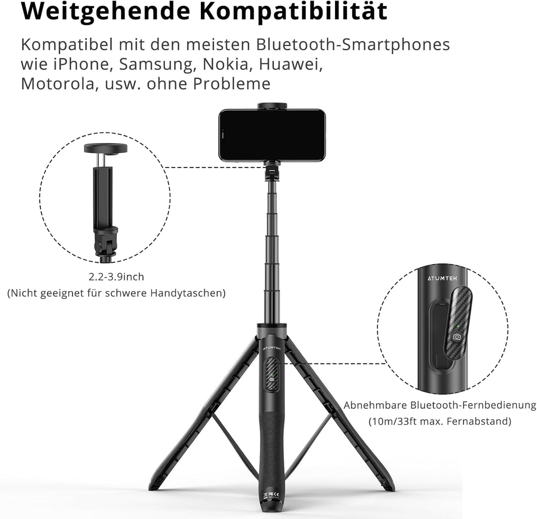 - ⭐[Stabile und grosse Dreibein-Grundlage] Dieser ATUMTEK handy selfie stick hat eine grosse 31.5 Zoll dreibein-grundlage mit drei rutschfesten silikonpolstern an den Füssen, welche grösstenteils jegliche schiefe oder kippende situationen vermeiden