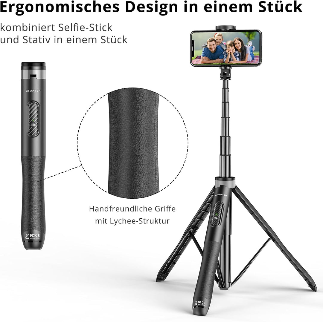 - ⭐[Einteiliges ergonomisches Design] Selfie Stick und dreibein werden alle zu einem einteiligen stativ zurückgezogen. Er ist leicht für die aufbewahrung und Reise. Der griff ist mit litschi-textur in einer ergonomischen Form für leichteres halten