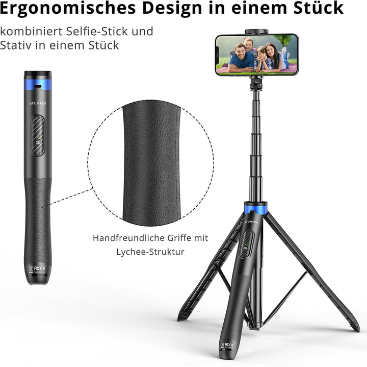 - ⭐[Einteiliges ergonomisches Design] Selfie Stick und dreibein werden alle zu einem einteiligen stativ zurückgezogen. Er ist leicht für die aufbewahrung und Reise. Der griff ist mit litschi-textur in einer ergonomischen Form für leichteres halten