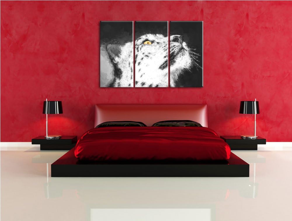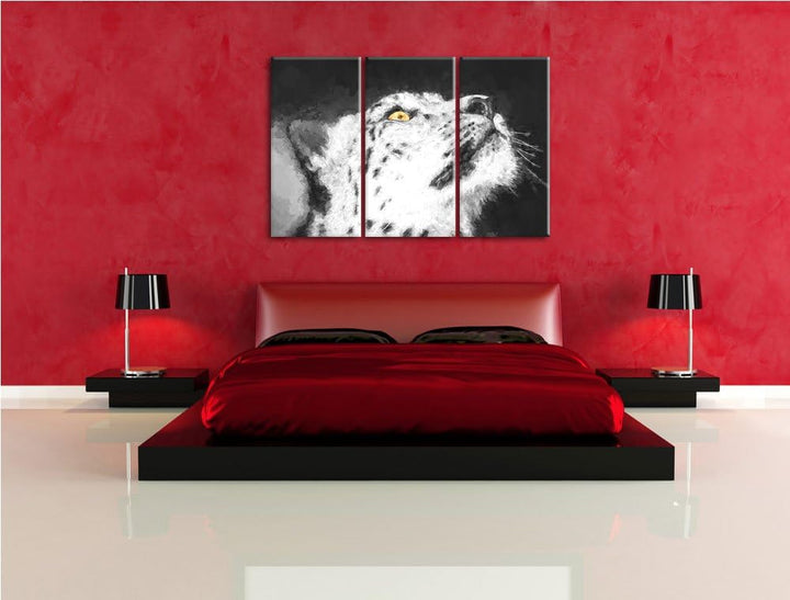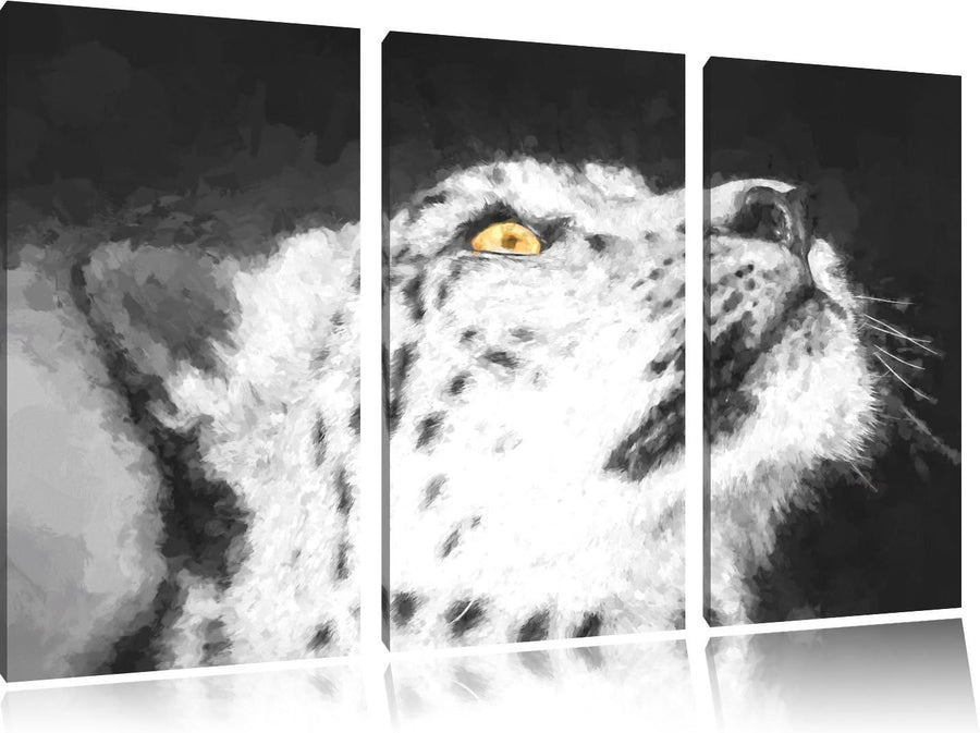 aufschauender Schneeleopard schwarz/weiss Deluxe 3-Teiler Leinwandbild 120x80 Bild auf Leinwand, XXL
