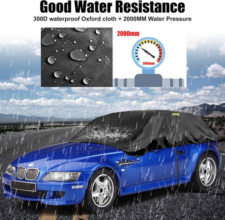 - Robust und langlebig: Die Halbgarage besteht aus verdicktem 300D-Oxford-Gewebe, das sehr wasser- und winddicht sein kann. Hochwertige Materialien und präzise Nähte sorgen für eine gute Wasserbeständigkeit. Stabile Gurte schützen Ihre Autoabdeckung