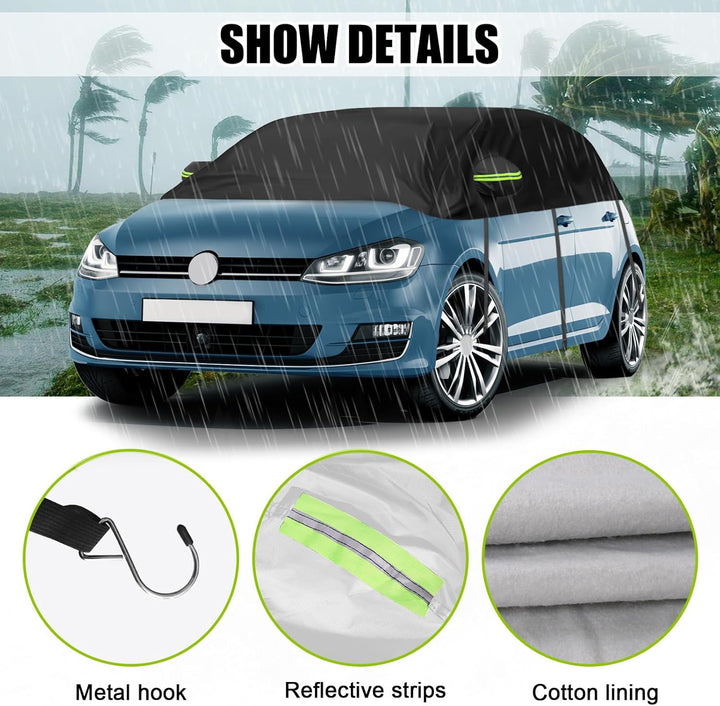 - Robust und langlebig: Die Halbgarage besteht aus verdicktem 300D-Oxford-Gewebe, das sehr wasser- und winddicht sein kann. Hochwertige Materialien und präzise Nähte sorgen für eine gute Wasserbeständigkeit. Stabile Gurte schützen Ihre Autoabdeckung