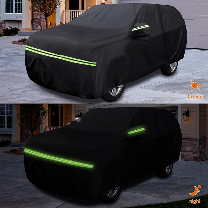 - 【Praktisches Design】 1) Türreissverschluss in der linken Seitentür für einfachen Zugang. 2) Winddichte Riemen vorne und hinten, um die Abdeckung bei schlechtem Wetter an Ihrem Auto zu befestigen. 3) Reflektierende Streifen, um Menschen nachts