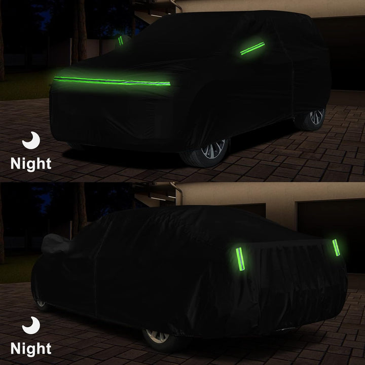 - Design-Details: 1: mit Türreissverschluss auf der linken Seite für einfachen Zugriff. 2. Winddichte Bänder vorne und hinten, um Ihre Autoabdeckung bei starkem Wind zu fixieren. 3. Reflektierende Streifen, um Menschen in der Nacht zu erinnern. 4.