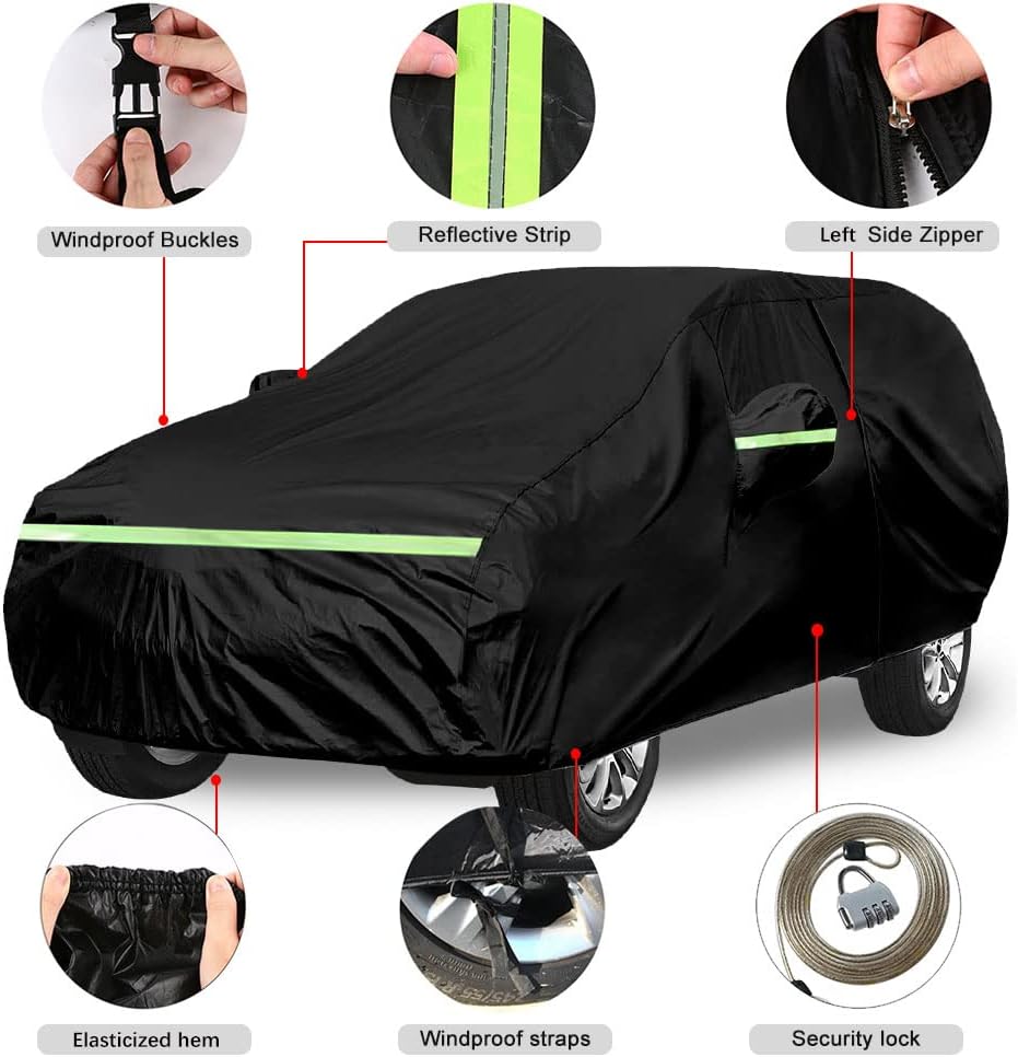 - 【Praktisches Design】 1) Türreissverschluss in der linken Seitentür für einfachen Zugang. 2) Winddichte Riemen vorne und hinten, um die Abdeckung bei schlechtem Wetter an Ihrem Auto zu befestigen. 3) Reflektierende Streifen, um Menschen nachts