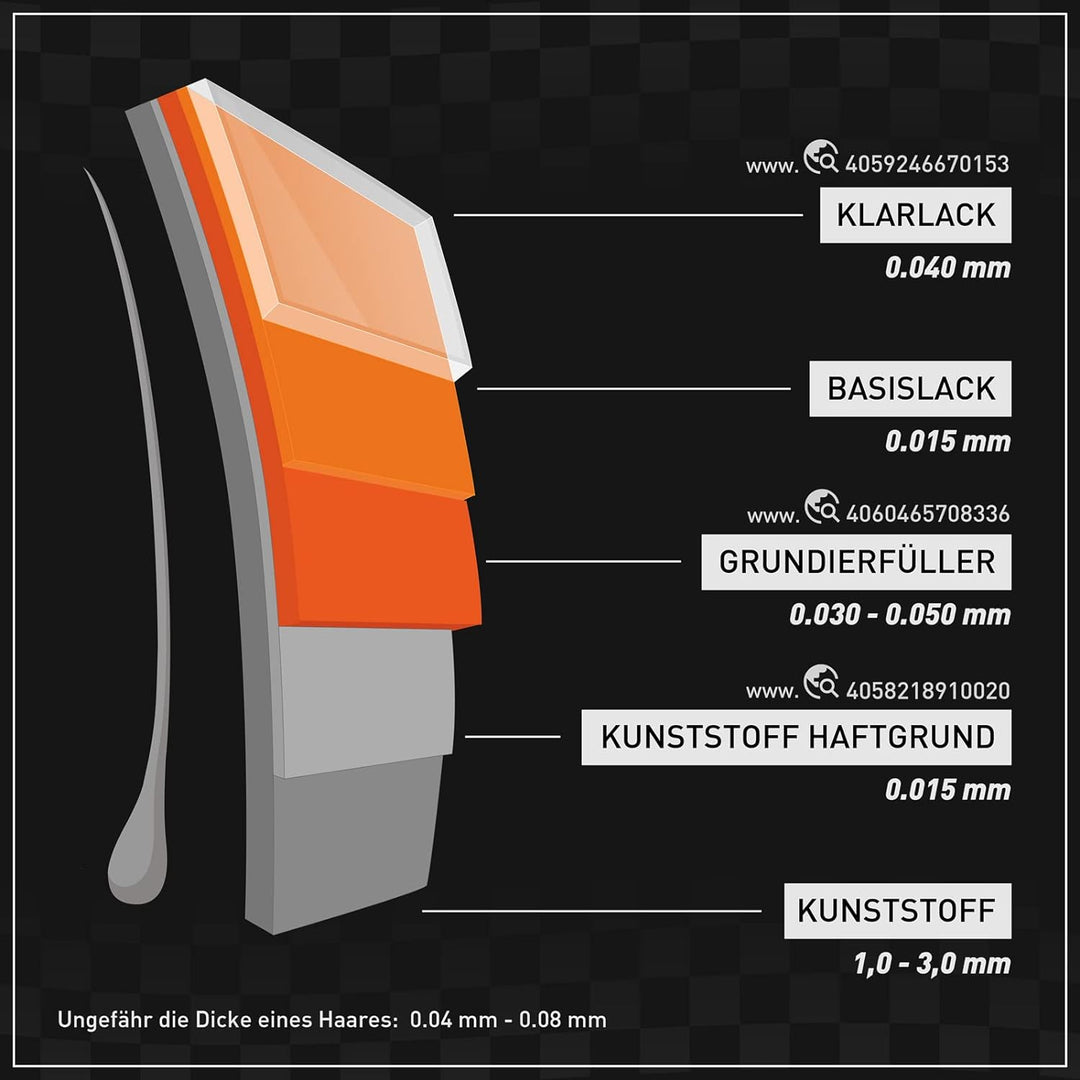 - Kunststoff Haftgrund als dauerelastische Grundlage für den darüber liegenden Basislack.