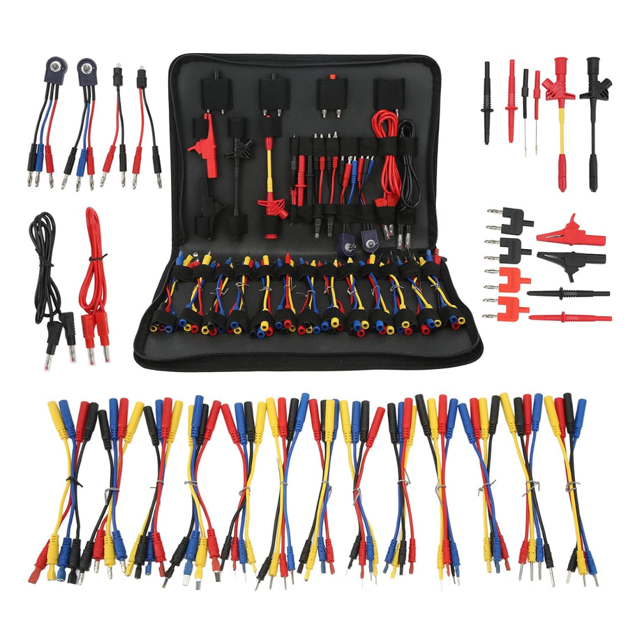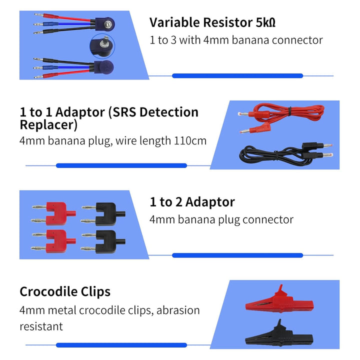 - MULTIFUNKTIONSSET: Elektrisches multimeter-prüfset mit variablem 5KQ-widerstand, flachanschluss, rundanschluss, SRS-test-ersatzeinheit, 1-zu-2-adaptern, 1-zu-1-adapter, LED-licht, clips, sicherheitsprüfhaken, sonde und aufbewahrungstasche.