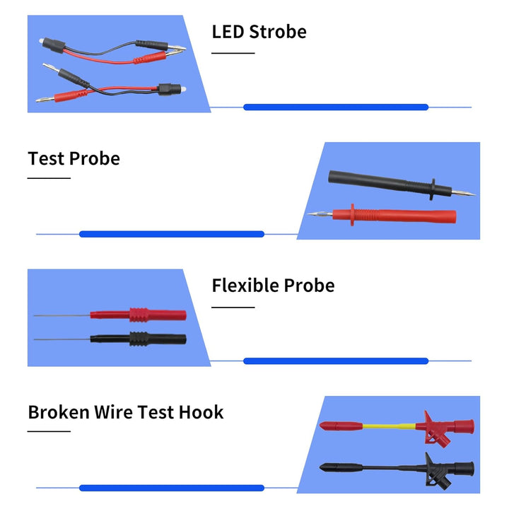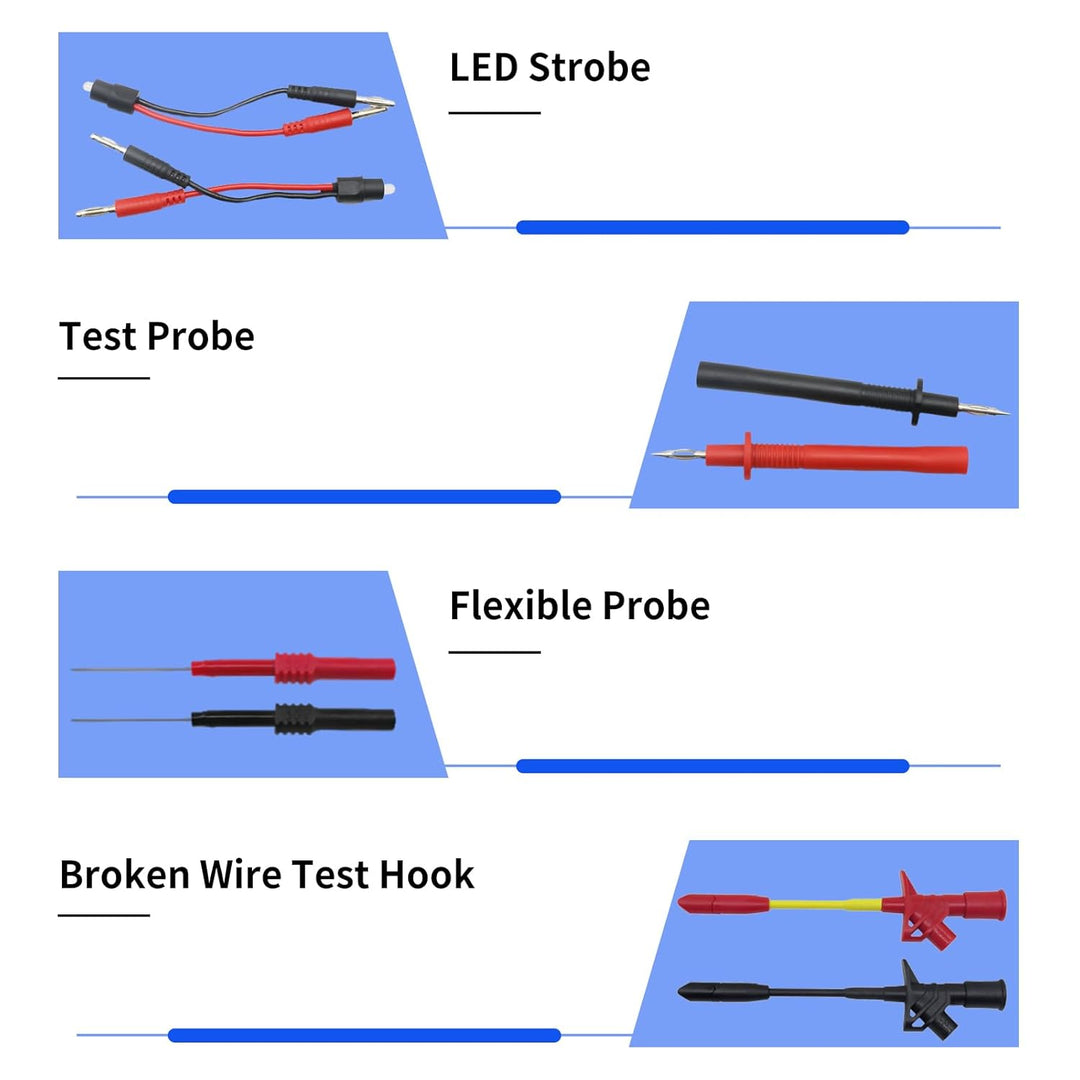 - SONDEN UND KROKOZIMMERKLEMMEN: Der hintere sondenkabelsatz verfügt über 2 sonden, die problemlos in kfz-anschlüsse für kabelbaumstecker, kraftstoffeinspritzdüsen und kfz-sensoren eingesteckt werden können. Krokodilklemmen sorgen für verbesserte