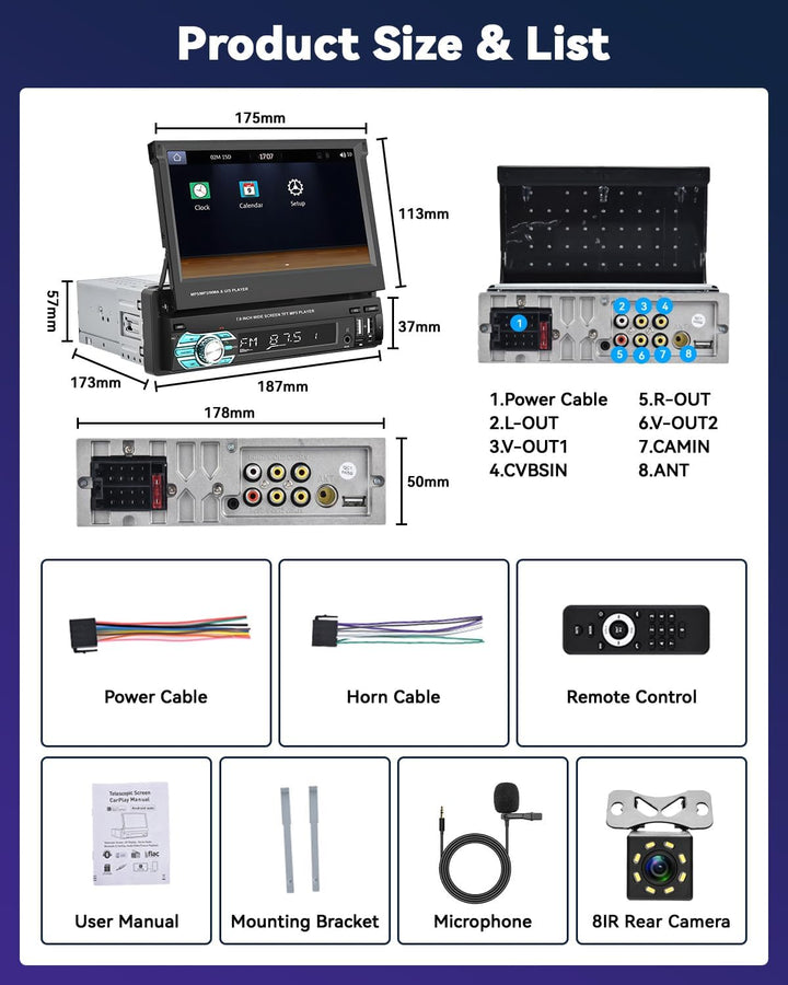 - 【Autoradio 1din mit Typ-C Schnittstelle】: Autoradio 1 din Bluetooth Produktgrösse: 187mm*57mm, mit 7 Zoll HD Bildschirm Autoradio mit Typ-C Schnittstelle/USB Schnittstelle, und Mikrofonschnittstelle. Die Typ-C-Schnittstelle erleichtert das schnelle