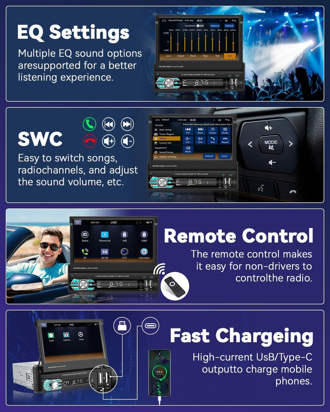 - 【Einstellbarer EQ/UI-Hintergrund】: Das Autoradio 1din bluetooth verfügt über eine EQ-Funktion. Benutzer können eine Vielzahl von Soundmodi einstellen, um das Gefühl zu vermitteln, das durch verschiedene Soundeffekte hervorgerufen wird. Der