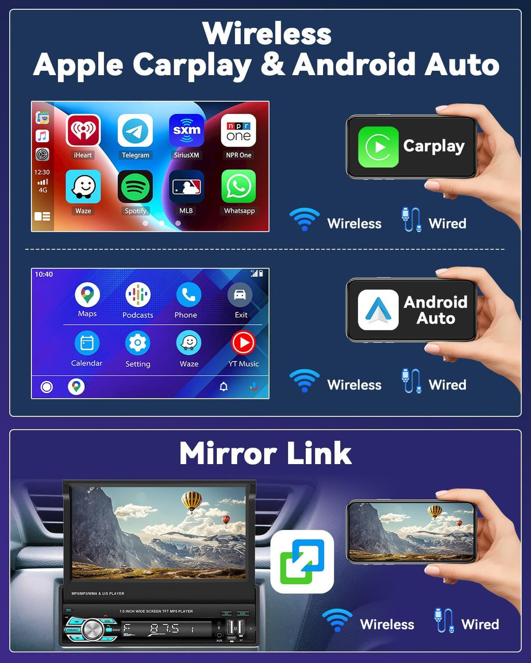 - 【Wireless Carplay/Wireless Android Auto】: Autoradio 1din mit Bluetooth-Freisprecheinrichtung unterstützt drahtlose Carplay- und Android Auto-Funktionen, was bequemer und schneller ist als herkömmliche Nicht-Android-Autoradios. Nach dem Herstellen