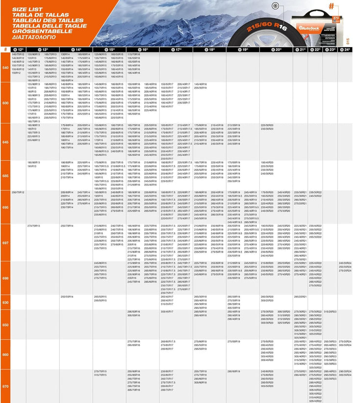 - Die Grössenübersicht in den Produktbildern zeigt eine Tabelle mit allen Reifendimensionen, die mit dem entsprechenden AutoSock Modell kompatibel sind. Die erweiterte Autoreifenliste in den „Wichtigen Informationen“ auf dieser Produktseite zeigt die