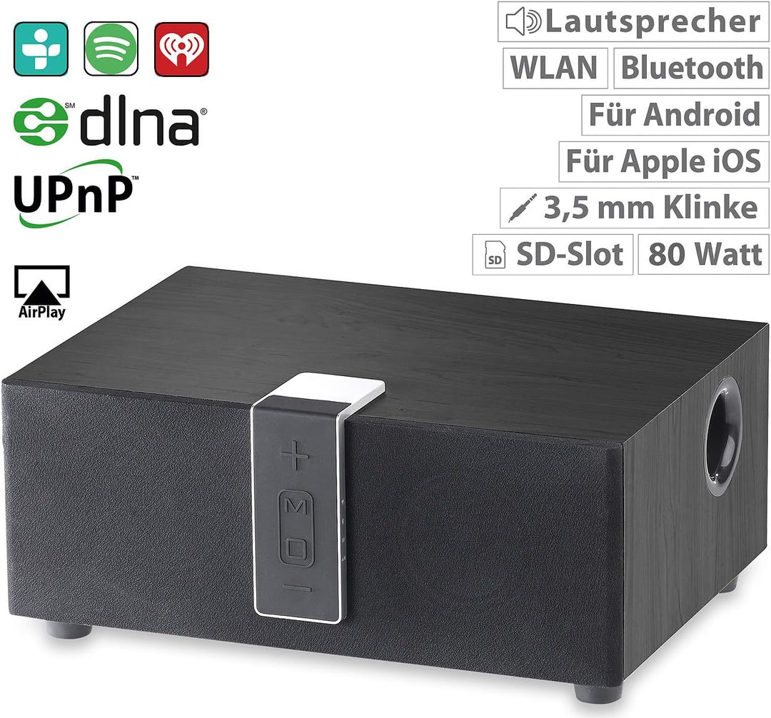 - Per WLAN, Bluetooth, AirPlay, DLNA und UPnP streamen Sie Ihre Lieblingsmusik kabellos von Smartphone, Tablet-PC, Notebook & Co. • Klangstarker Stereo-Sound: Zwei Lautsprecher und ein Subwoofer im Boden sorgen für eine klare Wiedergabe der Mitten und