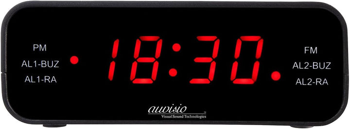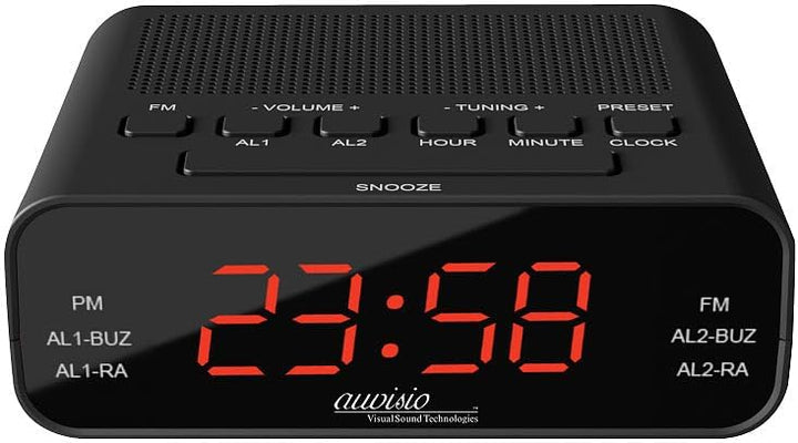 • 2 Weckzeiten einstellbar, jeweils mit separater Ein/Aus-Taste • Schlummer-Funktion für erneutes Wecken nach einstellbarer Zeit • Grosse LED-Anzeige mit roten Ziffern zeigt Uhrzeit oder Sendefrequenz • FM-Radio mit 10 Speicherplätzen •