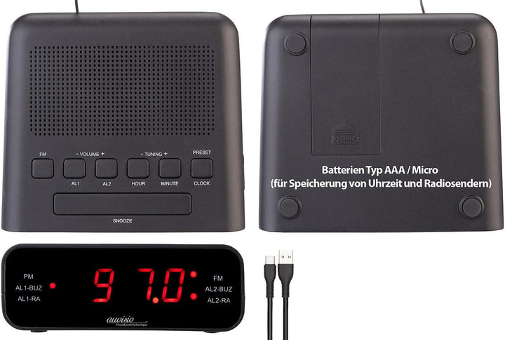 • UKW-Radiowecker inklusive USB-Ladekabel (USB-A auf USB-C) und deutscher Anleitung. Wecker Digitale USB - Dualwecker mit Speicherfunktion für Sender und Uhrzeit bei Stromausfall