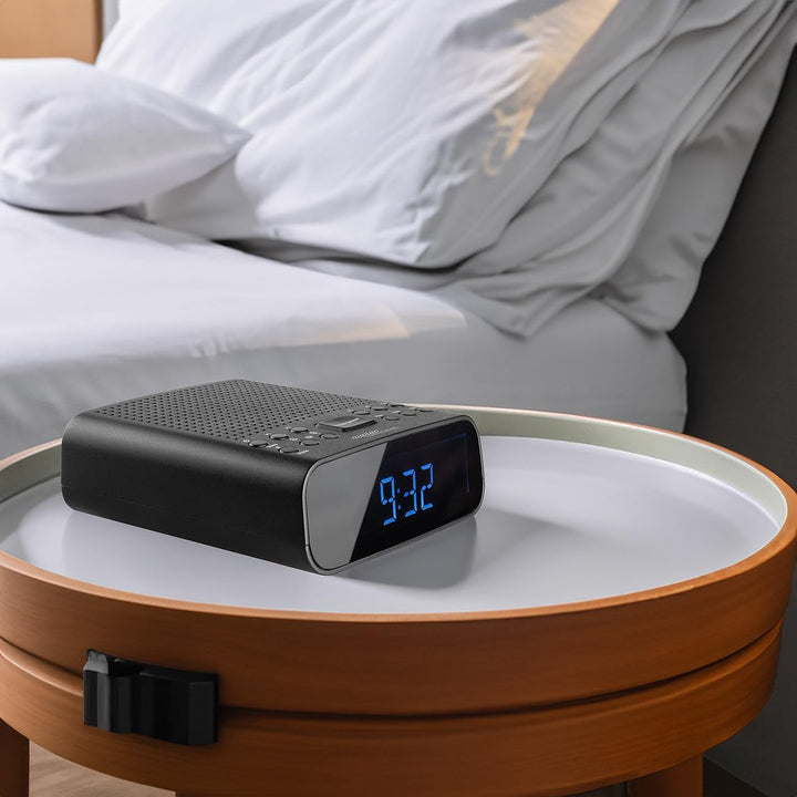 - Grosse Senderauswahl von UKW und DAB+ Radiostationen • 2 einstellbare Weckzeiten mit Schlummer-Funktion, Sleep-Timer • Kopfhörer-Klinke-Ausgang (3,5 mm) • Integrierter USB-A-Ladeport (5 V / 1 A) • Eingangswechselstromfrequenz 50/60 Hz •