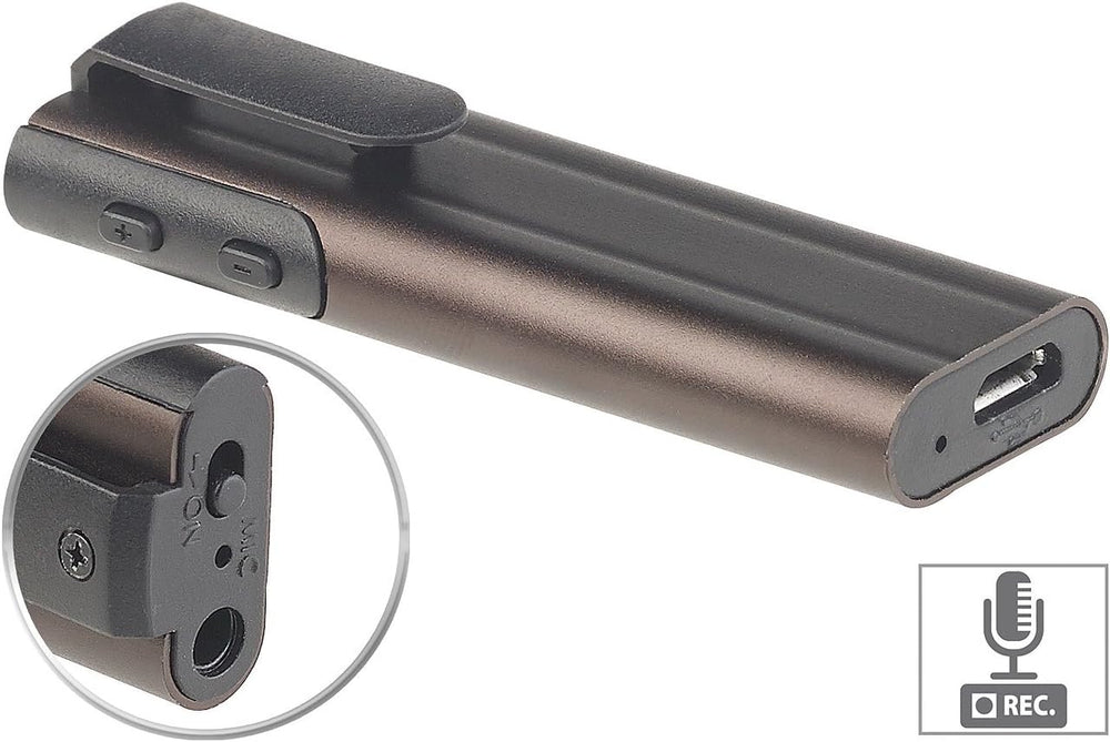 - Geräuschaktivierte Aufnahmefunktion (VOX-Funktion): startet ab 50 dB • Speicher: 8 GB, für bis zu 90 Stunden Aufnahmen oder Ihre Musik • PC-Anschluss per Micro-USB 2.0: zum Laden und Dateien übertragen • Halteclip zur Befestigung an Gürtel, Hemdtasche & Co. • Masse: 63 x 20 x 11 mm, Gewicht: 13 g