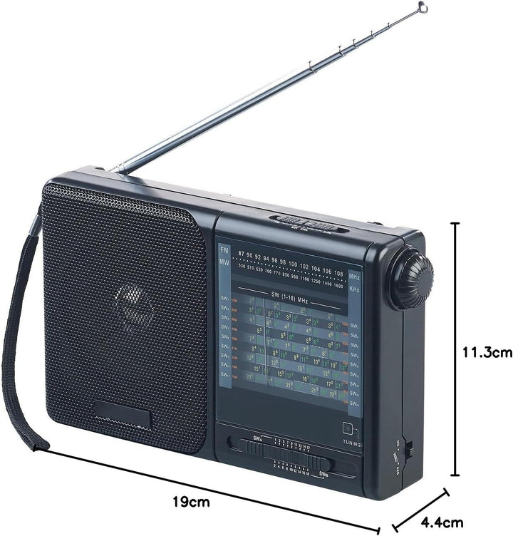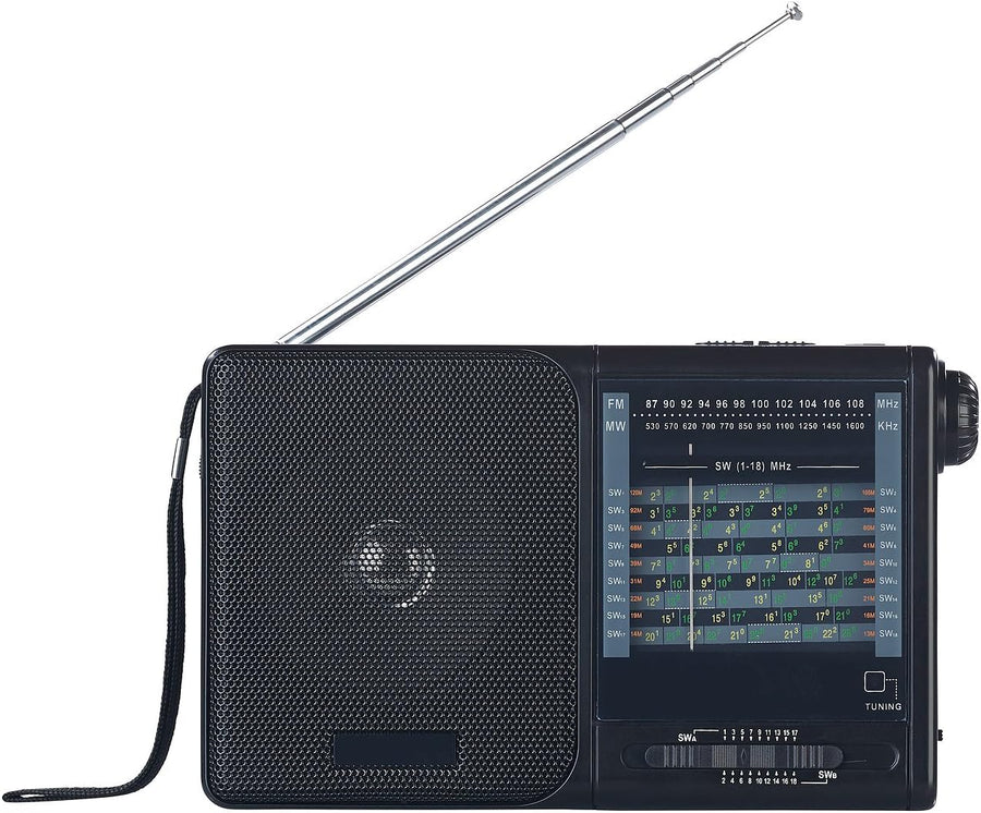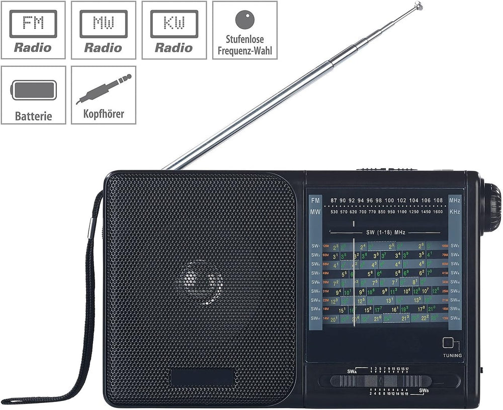 - Analoger 20-Band-Weltempfänger TAR-605 • Analoge Frequenz-Skala für FM / MW / KW 1-18 • Stufenlose Lautstärke-Regelung per Drehregler • Integrierter Lautsprecher, Leistung: 1 Watt (RMS), Musik-Spitzenleistung: 2 Watt • Praktische Handschlaufe