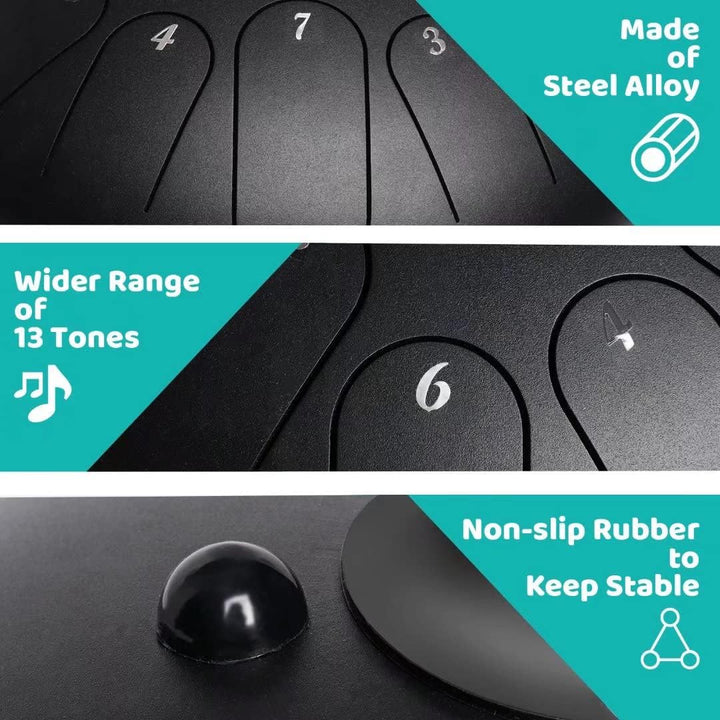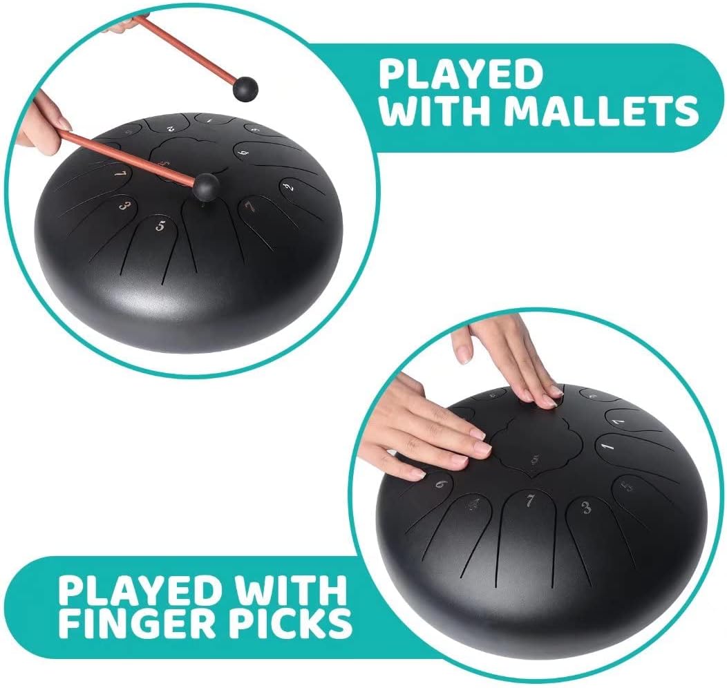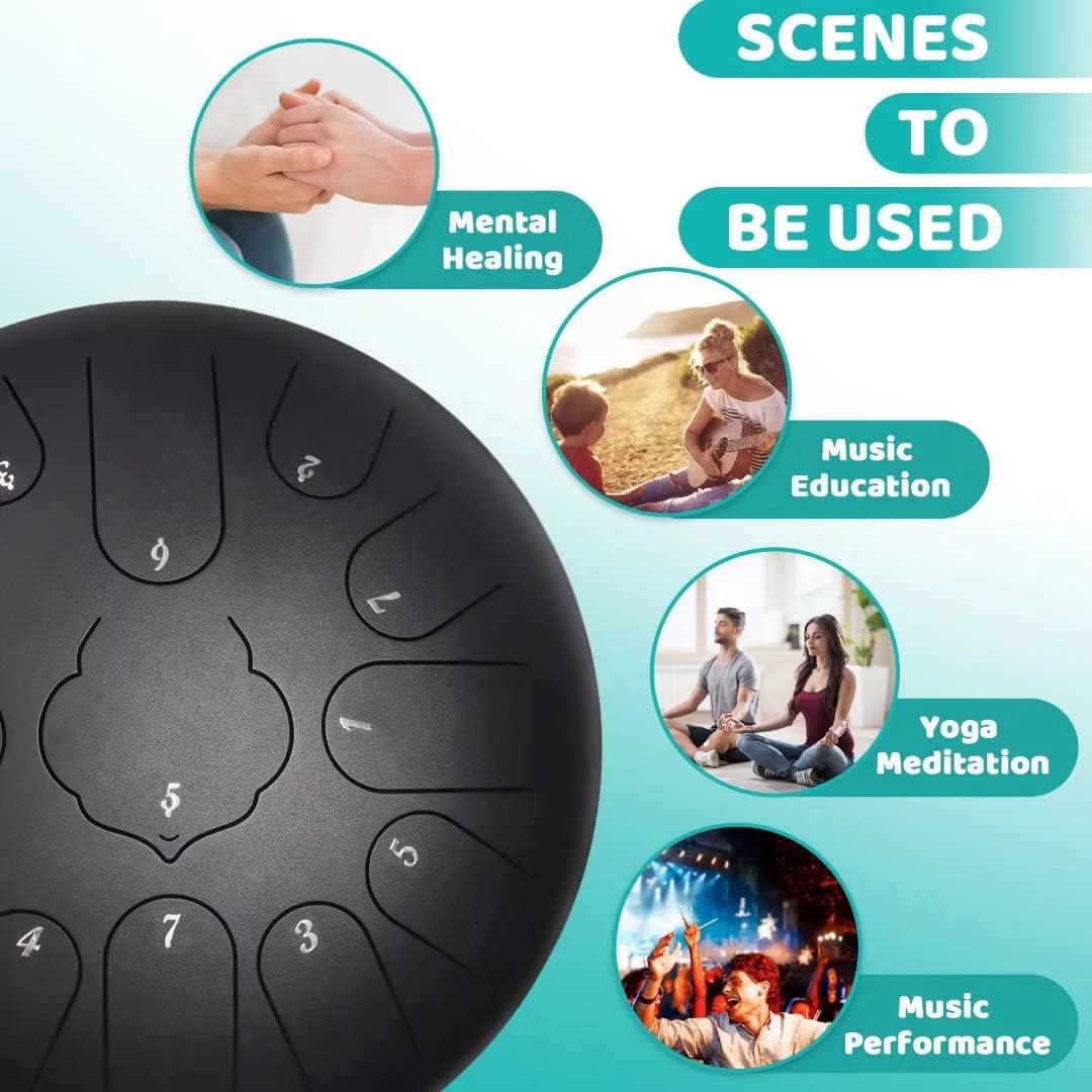 - đ”ă12 Zoll & 13-Noten-StahltrommelăDiese Stahlzungen Trommel erzeugt reine und beruhigende Stimme, die helfen, Stress abzubauen und Ruhe und Entspannung zu geniessen. Die Trommel hat einen breiteren natĂŒrlichen Bereich von 13 Tönen und kann in