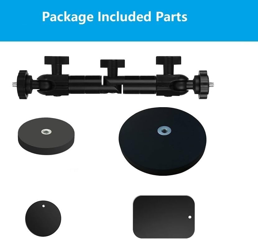 - Lieferumfang: 1 x Dual-Magnetsauger mit drehbarem Arm mit 1/4-Zoll-20-Gewinde, 1 x runde Eisenmetallplatte mit Klebstoff, 1 x rechteckige Eisenmetallplatte mit Klebstoff