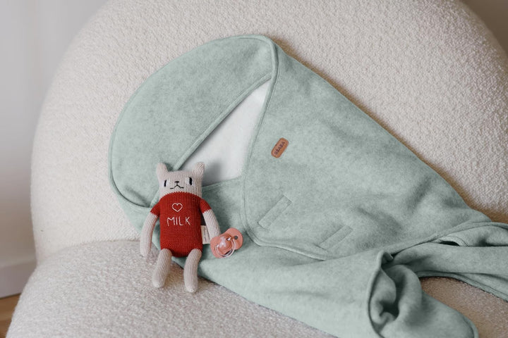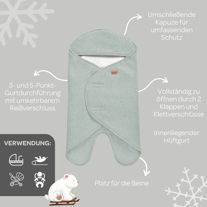 - WICKELDECKE: Ergonomisch vorgeformte, mit Fleece gefütterte Decke, die das Baby einhüllt, ideal nach der Entbindung.