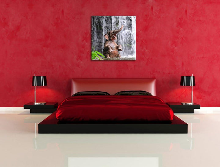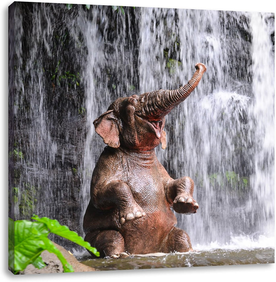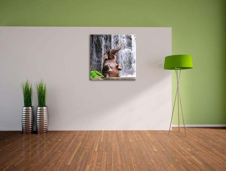 Babyelefant am Wasserfall, Format: 70x70 auf Leinwand, XXL riesige Bilder fertig gerahmt mit Keilrah
