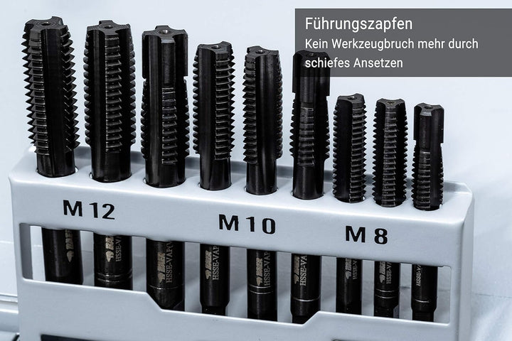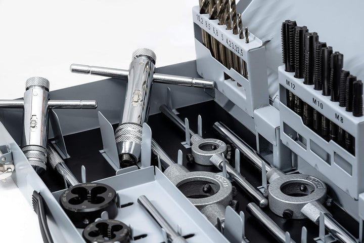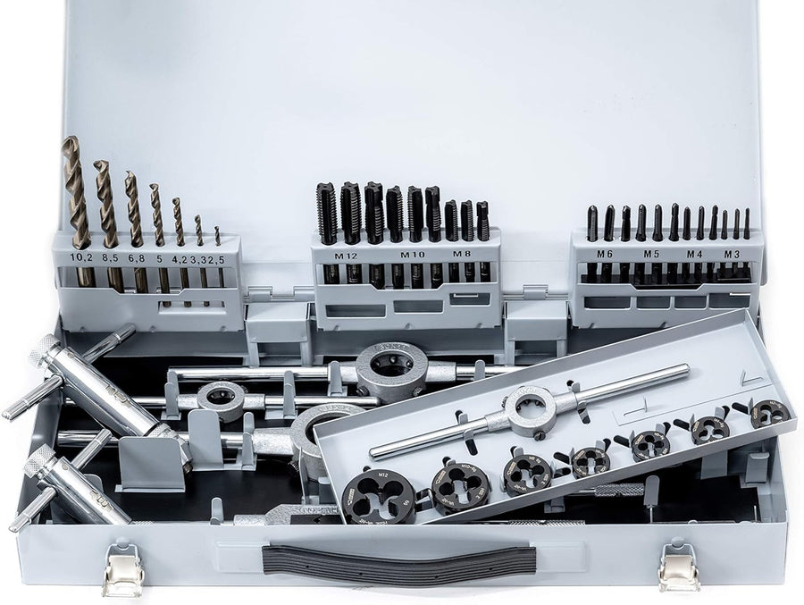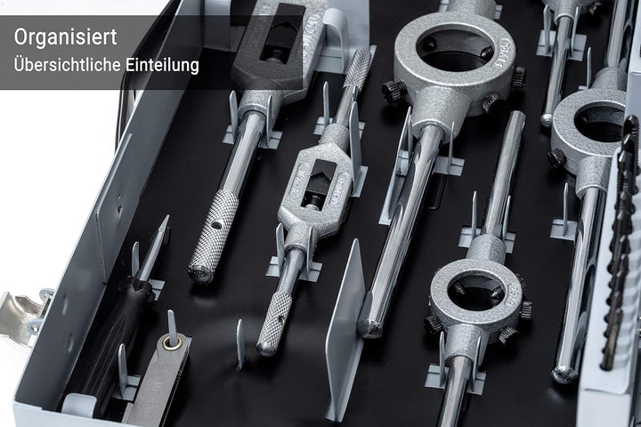 - SATZINHALT - Handgewinderbohrer-Sätze | Schneideisen | Spiralbohrer & Betätigungswerkzeuge: M3 - M12 - geliefert wird das Gewinderschneider Set in einer stabilen Metallkassette