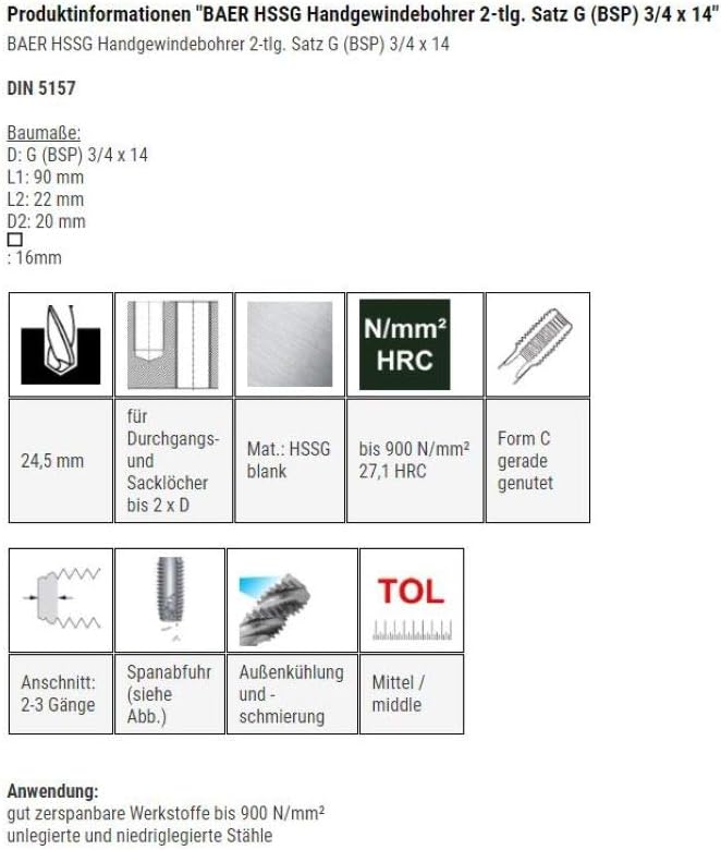BAER HSSG Handgewindebohrer 2-tlg. Satz G (BSP) 3/4 x 14 - Handgewindebohrer-Satz | Rohrgewinde | Ge