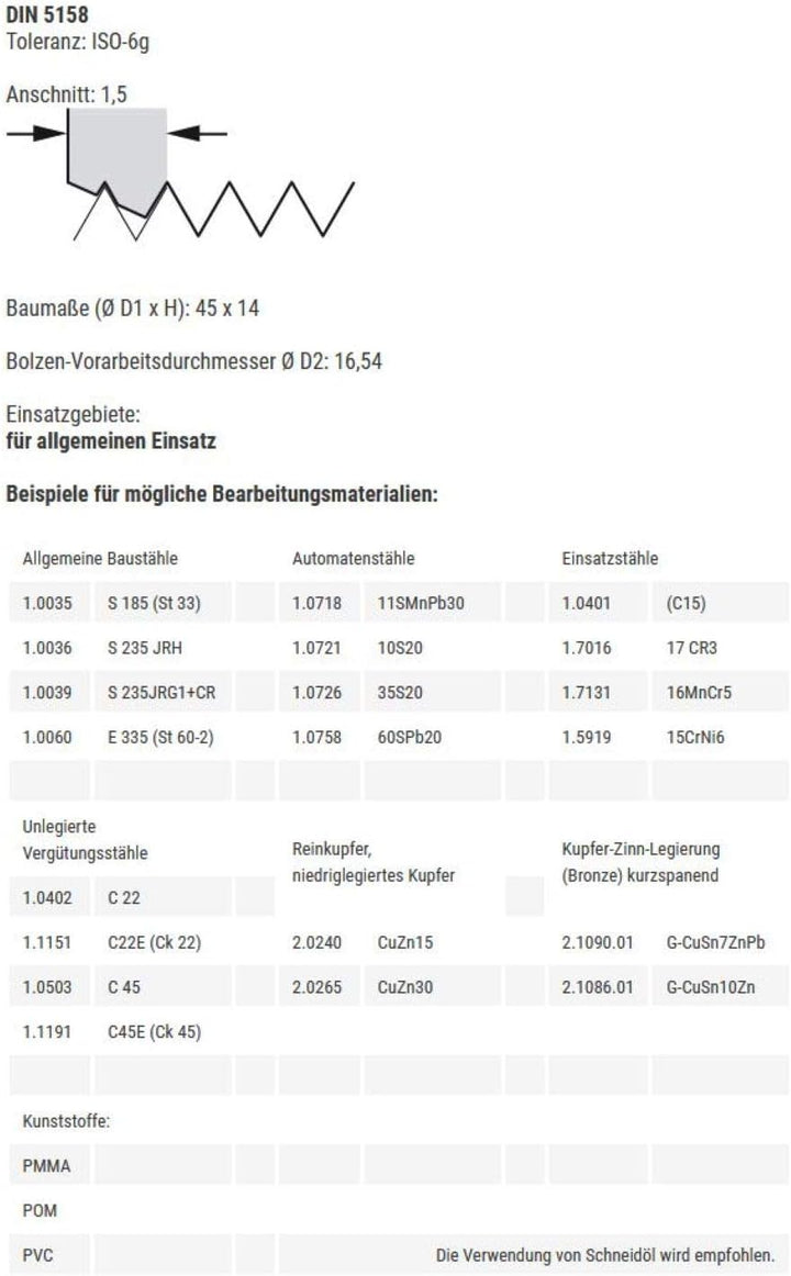 - PRODUKTINFORMATIONEN - BAER Schneideisen G 3/8 x 19 - HSS | DIN 5158 Toleranz: ISO-6g | Anschnitt: 1,5 | Baumasse (Ø D1 x H): 45 x 14 | Bolzen-Vorarbeitsdurchmesser Ø D2: 16,54 | Einsatzgebiete: für allgemeinen Einsatz