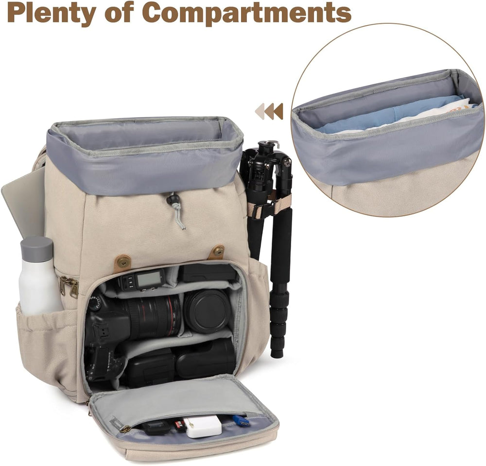 - Fächer - oberer Raum zur Aufbewahrung persönlicher Gegenstände; untere Kamerazone für 1 DSLR-Kamera mit 70-200 mm Objektiv, 3-4 Standardobjektiven, vorderer und innerer Zubehörtasche, Wasserflasche und Stativhalter