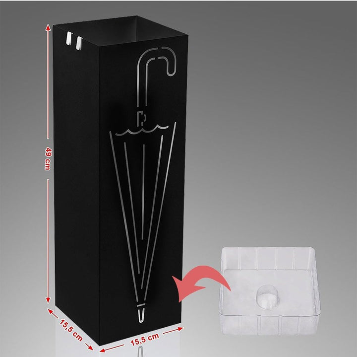 - Dieser besondere Schirmständer ist mit einer Kunststoff-Tropfschale ausgestattet, die Wassertropfen auffangen und den Boden schützt, und verfügt über interne Haken zum Aufhängen von faltbaren Regenschirmen und rutschfeste Gummifüsse.