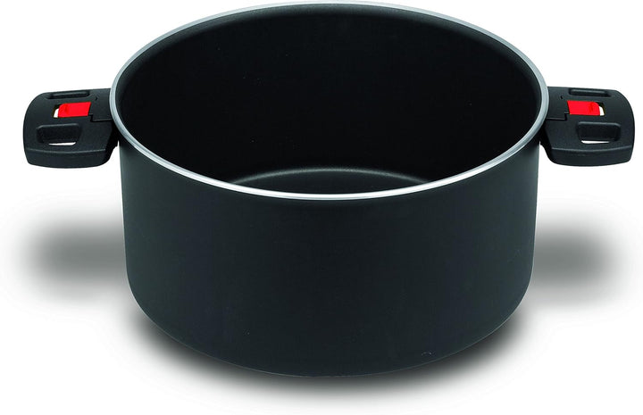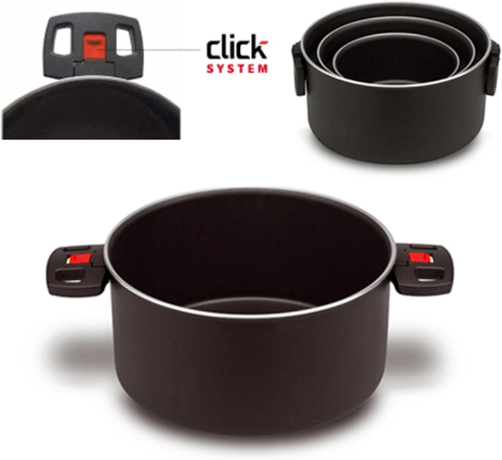 - Griffe mit innovativem Click-System: Bei Nichtgebrauch lassen sich die Griffe einklappen, sodass der Topf platzsparend gestapelt werden kann