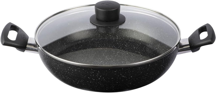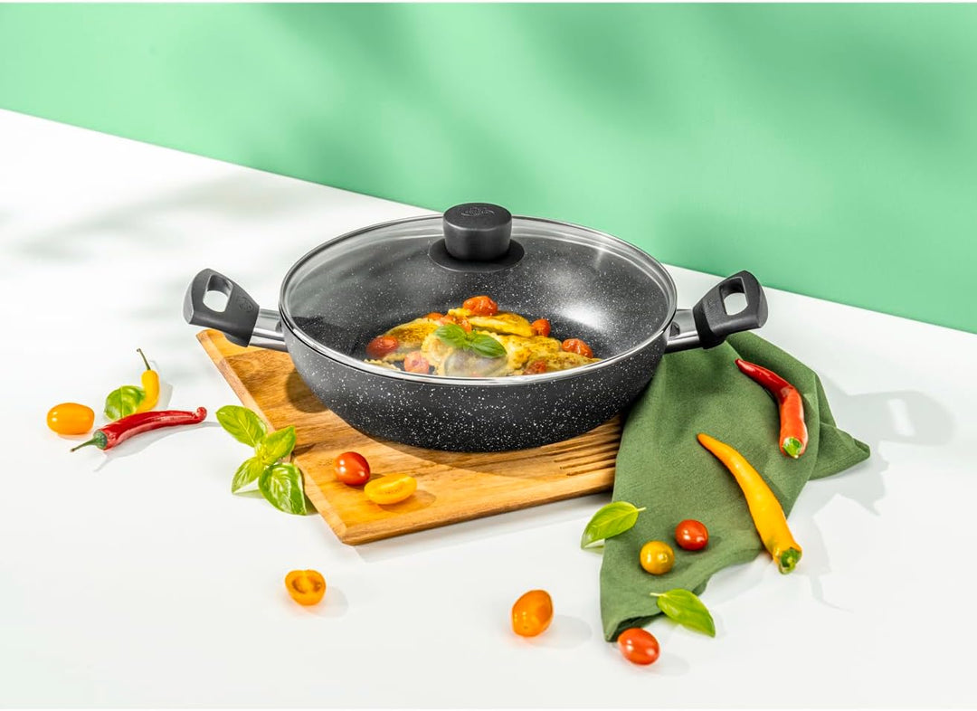 - LIEFERUMFANG: BALLARINI Vipiteno Bratentopf mit Deckel, rund, Ø Top 28 cm/Boden 21,4 cm, L42,7 x B29,1 x H13,7 cm, Aluminium, Nerolite Antihaftbeschichtung, alle Herdarten inkl. Induktion, spülmaschinengeeignet, Dunkelgranit mit weissen Punkten, Art.