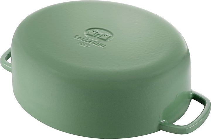 • LIEFERUMFANG: BALLARINI BELLAMONTE Cocotte 4,5 Liter, grün, oval, spülmaschinengeeignet, Ø 29 cm, H 14,9 cm, Gusseisen, Beschichtung: Kratzfeste Emaille, alle Herdarten, max. -20°/240° C, 1023108.