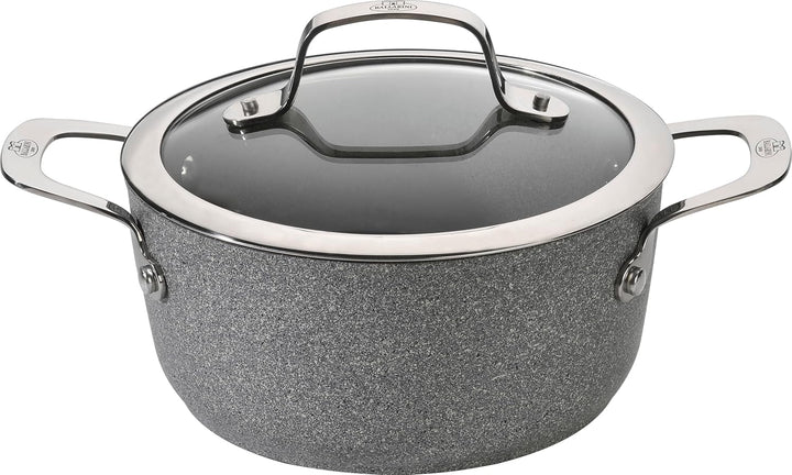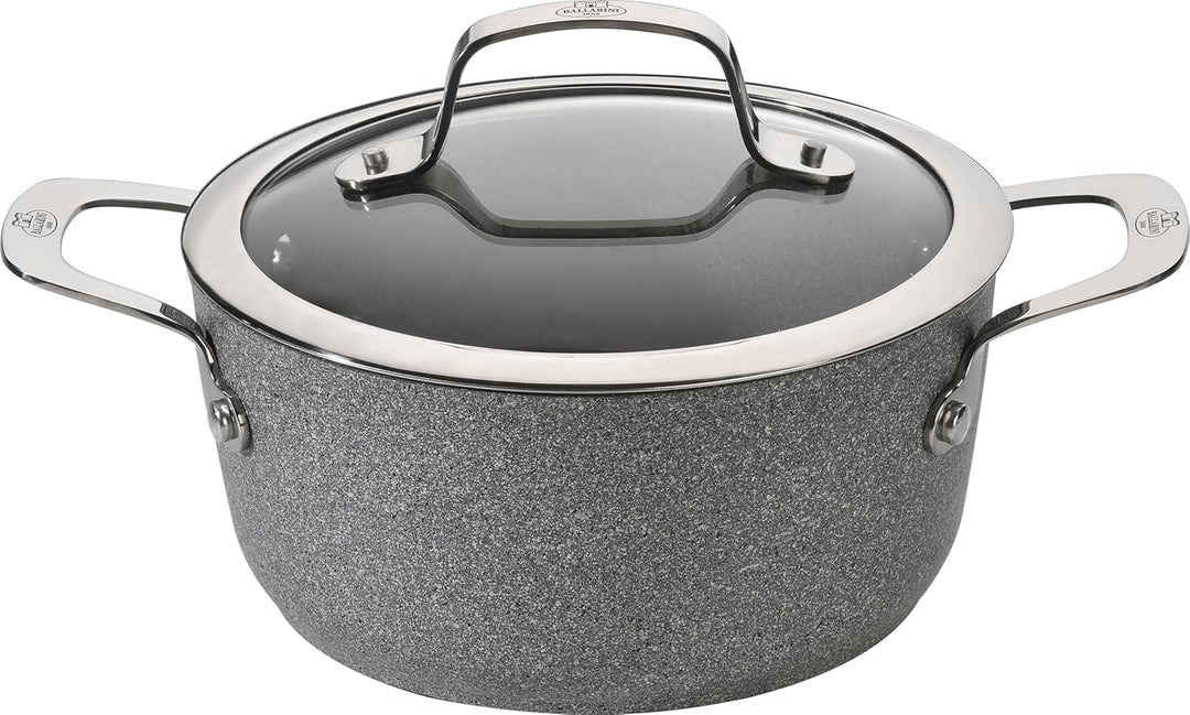 - Lieferumfang: 1x BALLARINI Salina Kochtopf mit Glas-Deckel,L x B x H: 25,30 x 34,20 x 18 cm, Füllmenge: 4,7 L, Oberer Durchmesser: 24 cm, Bodendurchmesser: 24 cm, Material: Aluminium (beschichtet) / Edelstahl-Griffe, Farbe: Grau - Steinoptik, 1007050