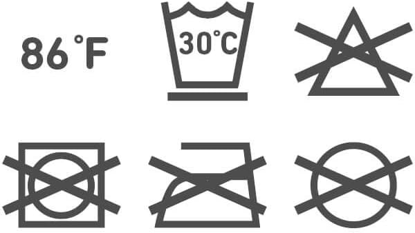 - Maschinenwäsche mit kaltem/lauwarmem Wasser (~30°C) im Schon- oder Feinwaschgang ohne Weichspüler, Nicht zum Bügeln oder für den Trockner geeignet